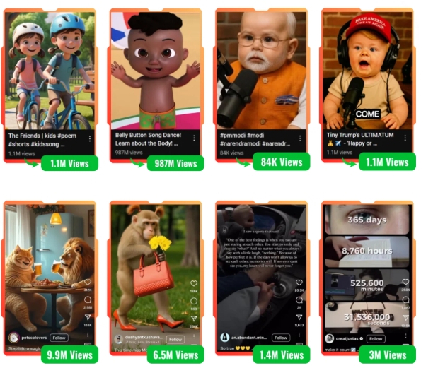 Choose from 10+ short-form formats like memes, product demos, motivational reels, avatar promos, baby/pet clips, and more.